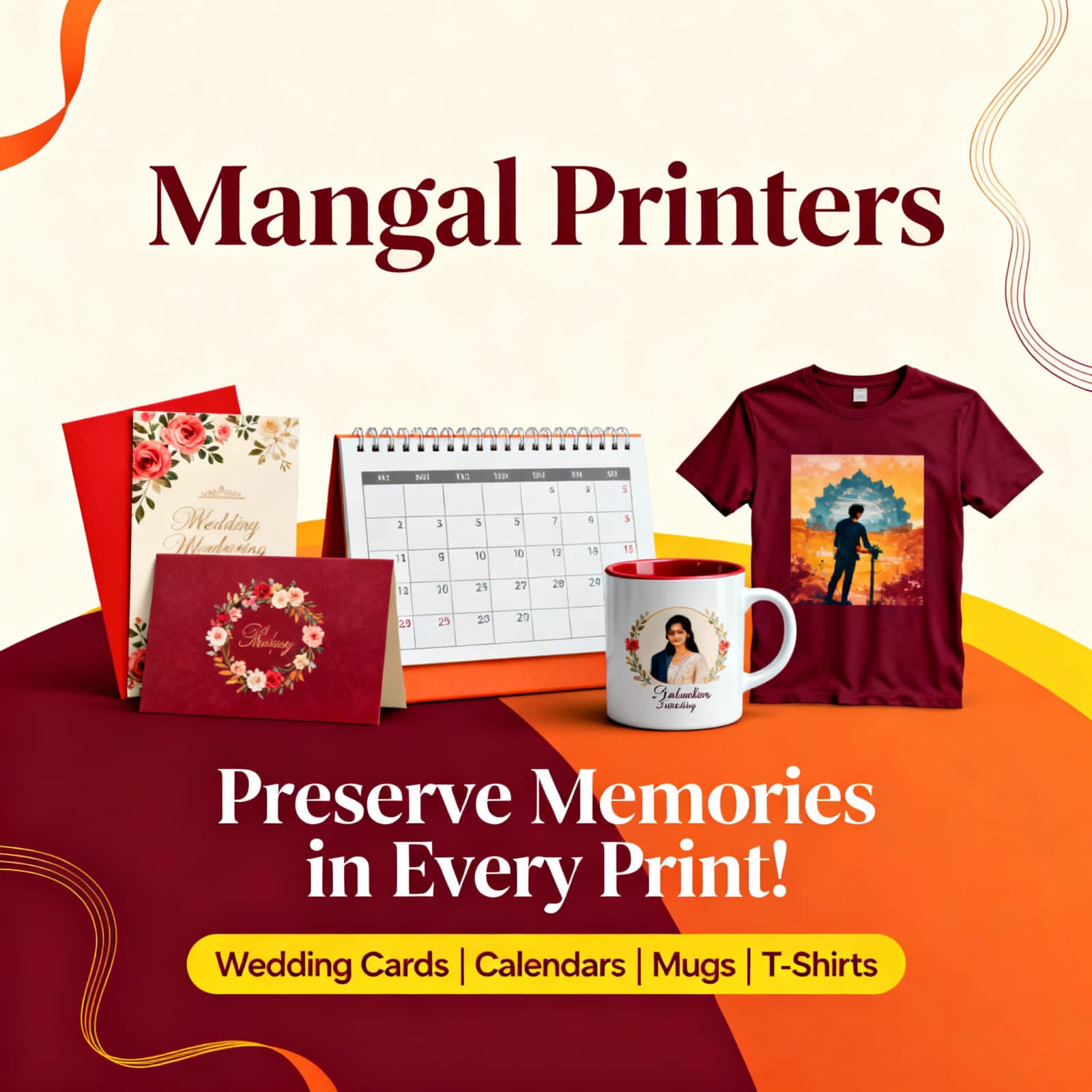 Here, at Mangal Printers we offer all kinds of printing services and customized products such as Coffee Mugs, T-Shirts, Wedding cards, Visiting Cards and many more under one roof. We ensure to deliver the best quality product at a very reasonable price, and also provide you with a good amount of discount on bulk orders.